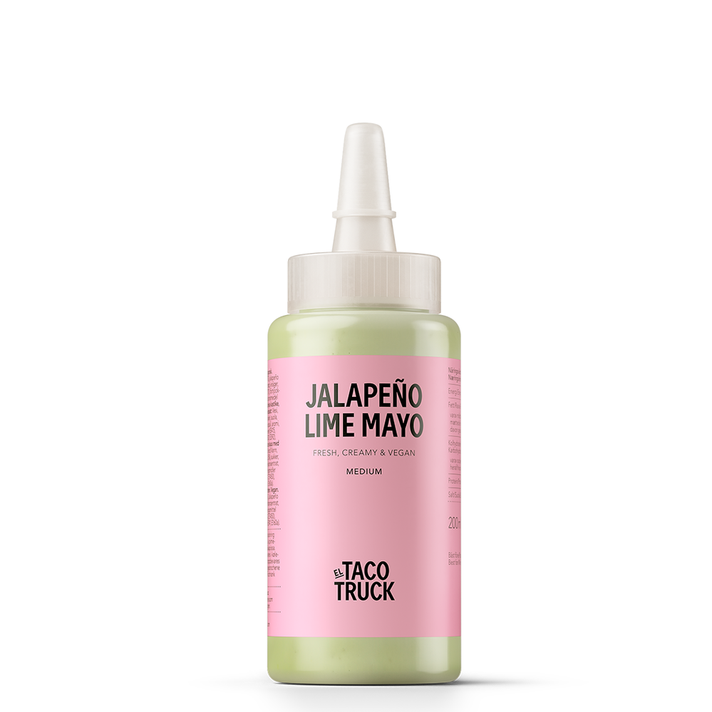 El Taco Truck Jalapeño Lime Mayo Vegan ir augu izcelsmes, krēmīga tekstūra, jalapeño viegls asums un svaigs laims padara šo mērci lieliski piemērotu tako, burgeriem, frī kartupeļiem vai vrapiem.