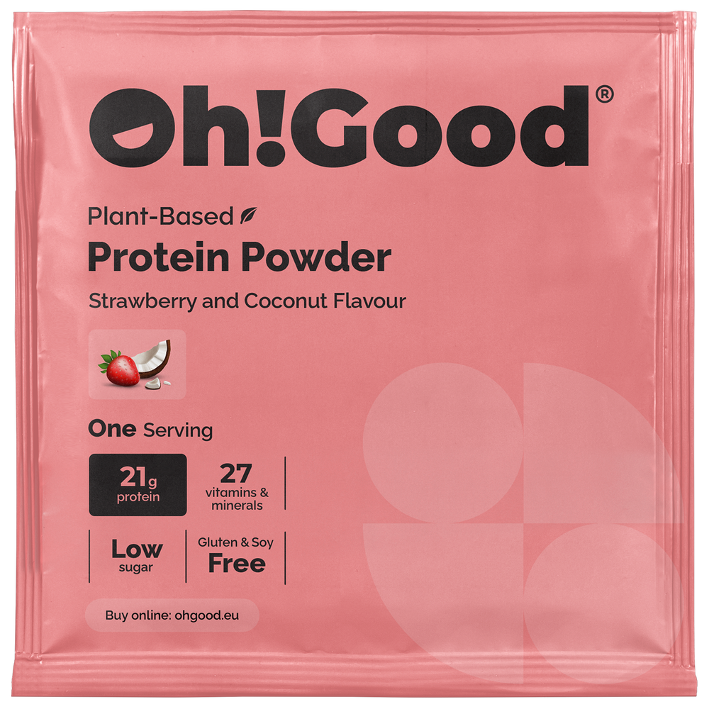 Sastāvdaļas: zirņu proteīna izolāts, rīsu proteīna koncentrāts, kaņepju proteīna koncentrāts, kokosriekstu piena pulveris, inulīns, sazarotās ķēdes aminoskābes (BCAA) 2:1:1, zemeņu garša, kokosriekstu garša, vitamīnu un minerālvielu maisījums (vitamīni (A, D, E, K, C, B1, B2, B3, B5, B6, B12, folskābe, biotīns), minerālvielas (kalcijs, cinks, selēns, hroms, molibdēns, jods, kālijs, fosfors, magnijs, dzelzs, varš, mangāns), koenzīms Q10), probiotiķu maisījums, stabilizētājs: ksantāna sveķi, saldinātājs: sukraloze, krāsviela: biešu ekstrakts.