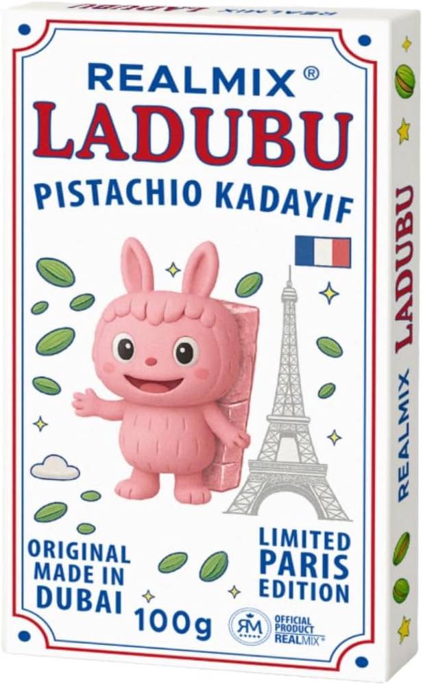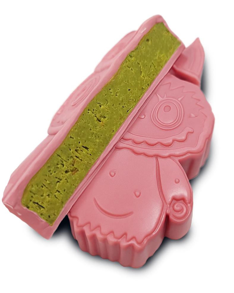 Sastāvdaļas: kakao sviests, cukurs, vājpiena pulveris, palmu eļļa, pistāciju rieksti (10%), kviešu milti, aveņu aromatizētājs, krāsvielas: E102, E124, E129, E133, E163